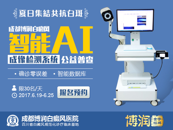 为了患者能尽快体验到这一设备带来的优势,成都博润白癜风医院决定于2017年世界白癜风日到来之际,开展为期七天(2017年6月19日—25日)的公益体验活动,患者通过网络和电话预约可公益免费体验智能AI成像检测,专家会根据检测结果为患者提供专业的诊疗建议和个性化的治疗方案,患者可提前预约到院体验智能AI成像检测。