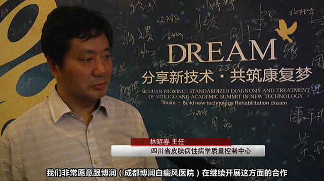 四川省皮肤病性病学质量控制中心林昭春主任接受采访说到:“我觉得这次培训班(峰会)非常成功;一方面我们是要向广大的基层的皮肤科医生,要推广我们在白癜风治疗的一套规范化办法, 同时,白癜风在治疗领域的一些新技术我们要向他们做一些介绍,而且把这个新技术逐步的进行推广,使我们广大的病人通过这个培训以后,能够得到医处为他们服好务,这就是我们基本的一个目的。”